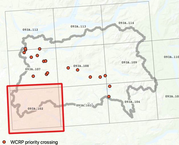 High-resolution PDF maps of the Horsefly River watershed and model results can be accessed here. The watershed is divided into multiple maps sheets to allow for detailed examination of modelled spawning and rearing habitat, multiple barrier types, and priority barriers identified through this planning process. The locations of WCRP priority barriers and associated map sheet numbers are shown below. In each individual map sheet, priority barriers are symbolized using the following notation:
